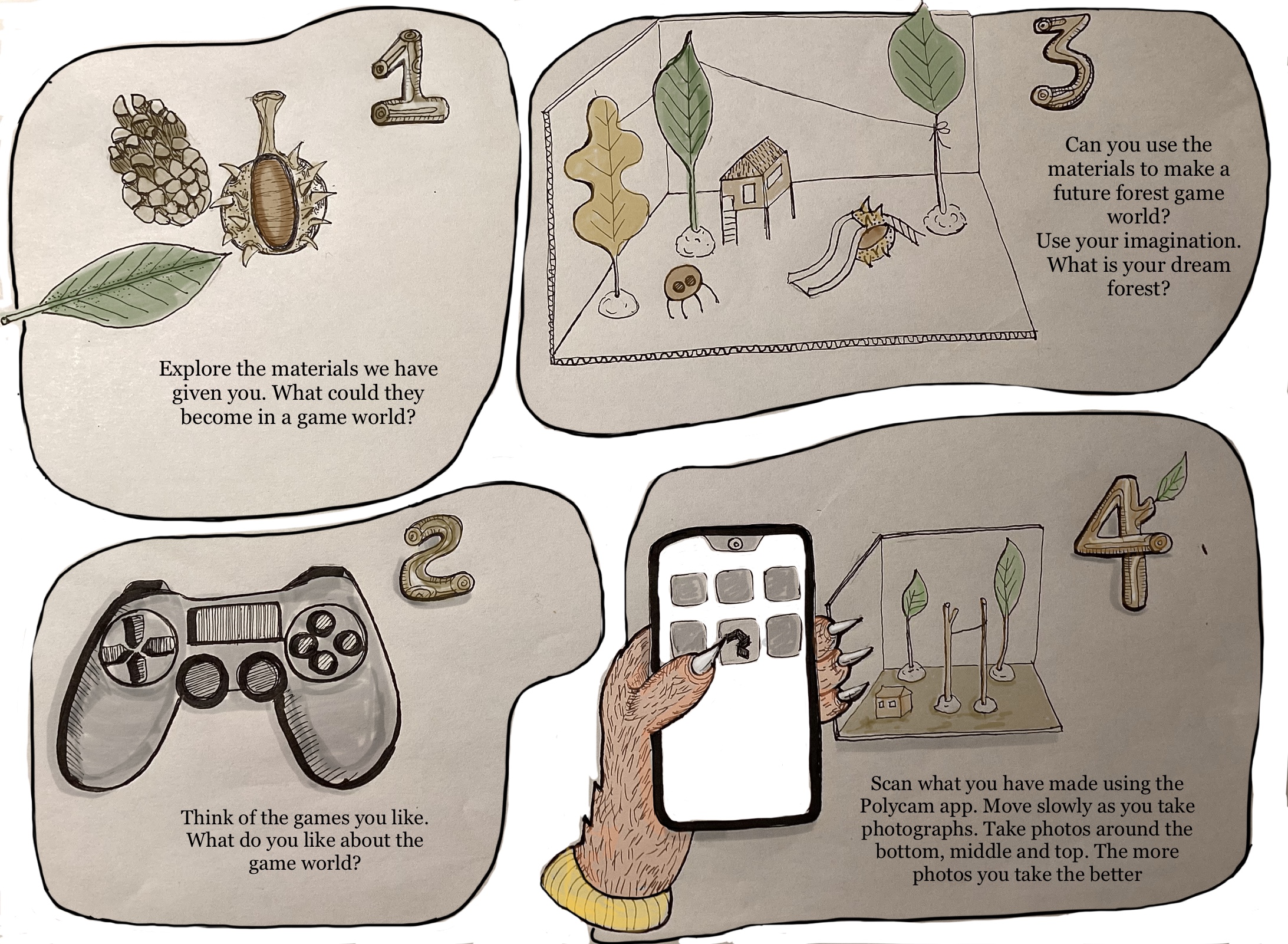 We designed and implemented a series of art and design-based workshops for late primary and early secondary school children to contribute to the development of a videogame about treescapes. The workshops were broken down to focus on different core elements used in game design: (1) Game Worlds, (2) Character Design and (3) Narratives & Gaming Mechanics.